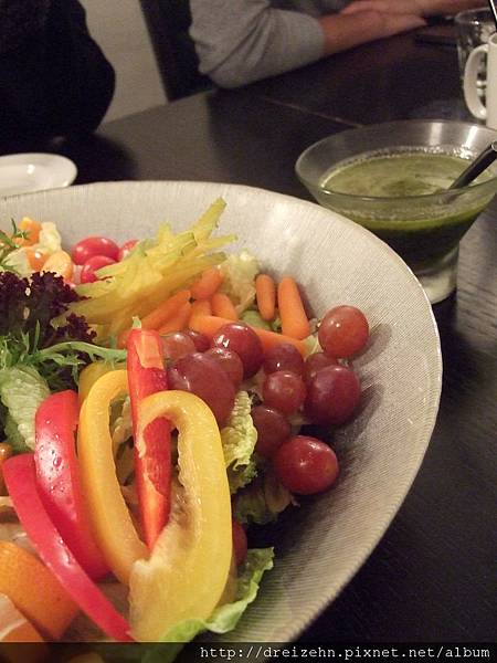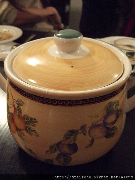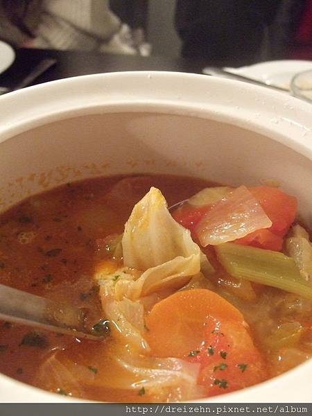 【蕃茄蔬菜湯】這道菜對我來說是整個晚上印象比較不深刻的部份,鍋子很可愛,然後我只記得大家一直要我把紅蘿蔔吃下去...... 如圖所見裡面有番茄、洋蔥、西洋芹、紅蘿蔔等蔬菜,我以為味道應該會很強烈,但據說紅蘿蔔吃不出什麼味道咧!或許該說是被蕃茄給調和了。(當然也不能排除是朋友想要哄騙我吃紅蘿蔔的說法)