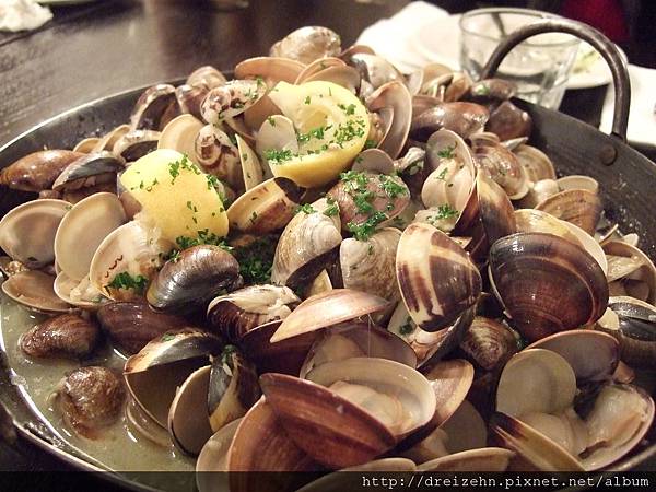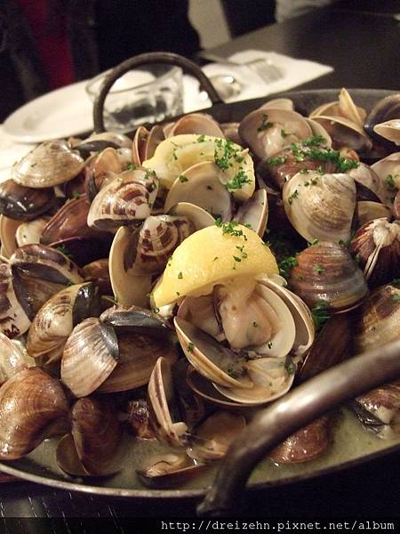 【白酒燒蛤蜊】感覺是一道吃完大拇趾關節會隱隱作痛的料理,鮮(ㄆㄨˇ)味(ㄌ一ㄣˊ)十足!XD 每個把殼張得大大的蛤蜊彷彿在說:來吃我吧!(招手) 盤底殘餘的蛤蜊精華也被大家分食殆盡,湯汁很鮮,也很鹹,但保證比蜆精好喝一萬倍!(是說我也沒喝過蜆精哪來這等拍胸脯掛保證的自信)
