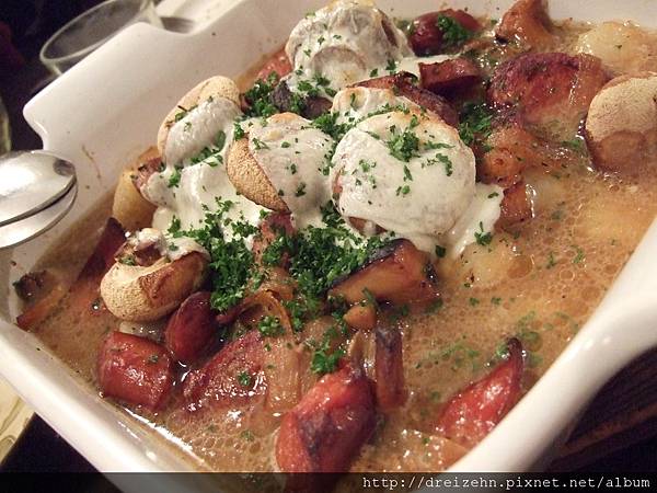 【私房菜─歐式香腸燉洋芋】上菜時服務生有特別提醒底層有鋪洋芋,不需要攪拌,直接一湯匙挖到底就對了。這道菜的調味偏鹹,上頭的磨菇對我來說蕈類的味道還是太重,不過湯汁配著緊接而來的手工麵包非常合拍。香腸算是還有點彈牙的口感,燉到入口即化的洋芋則是這道菜我個人最喜歡的部份。