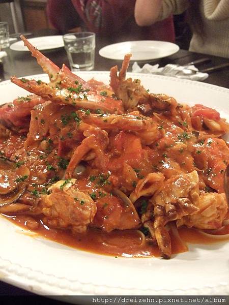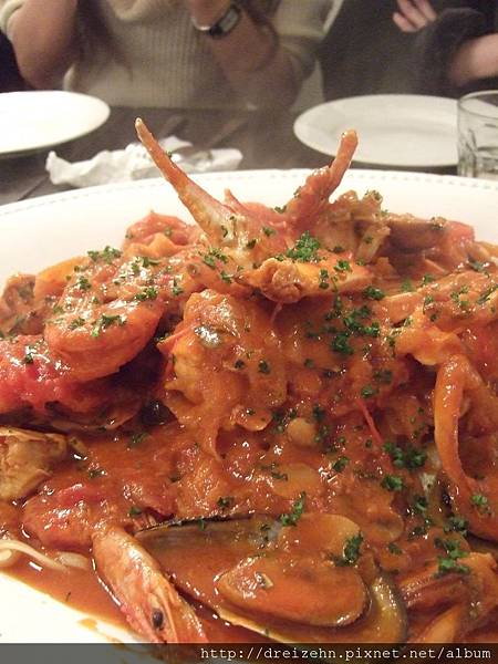紅通通熱騰騰的主菜【西西里紅燴海鮮細扁麵】(新注音輸入法跑出個西西"李宏慧"海鮮細扁麵,害我想說我有朋友叫這個名字嗎?囧>) 鮮蝦蟹腳花枝淡菜,用料算挺實在的吧?搭配細扁麵(Linguini)而不是我原本想像的spaghetti,細扁麵軟硬度適中並沒有煮到軟爛,調味屬於重口味但偏甜的紅醬,我很喜歡蘸滿了醬汁的麵條,吃到嘴角都是醬汁還意猶未盡咧!