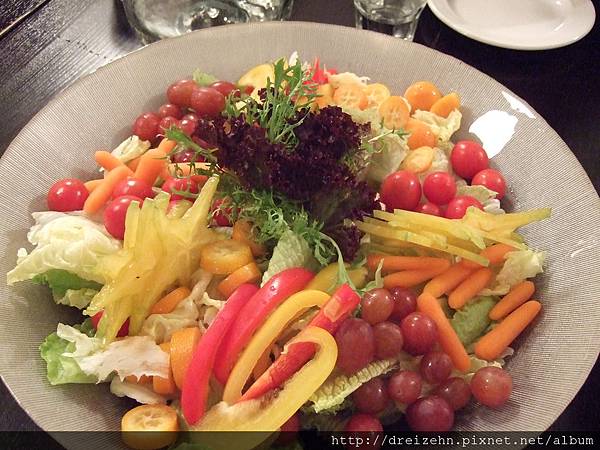 第一道料理是色彩繽紛的【蕃茄主義時蔬鮮果莎拉】。配色看起來賞心悅目,而且整盤除了盤子以外通通可以吃。葡萄跟蕃茄十分鮮甜,還有爽脆的生菜與甜椒,撘配上綠色的主廚特調醬汁,有義大利油醋沁入脾胃的酸(之所以有青醬的色澤據說是加入香草的關係),拿來當今晚的開路先鋒是明智的選擇。