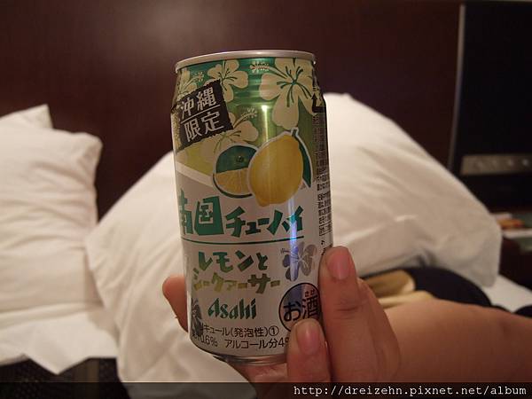 回旅館的路上便利商店買了兩罐Beer,ORION是當地的啤酒廠牌,在沖繩北部的名護還有啤酒工廠,下次有機會應該要去參觀品嚐一下的!包裝上那隻眉開眼笑的SHISA有著沖繩人的熱情!ASAHI這牌子大家都不陌生,衝著「沖繩限定」四個字當然要買來喝一下,包裝看起來就很有南國風情啊!這個シークァーザ據說是金桔口味,我還在國際通那邊買到這種散發清香的吸油面紙。清爽的口味,水果酒趴數不高一口氣乾掉也沒問題!呼乾啦!