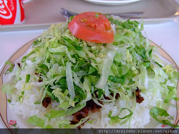 我們點了一道「タコライス野菜」(¥500),這就是所謂的TACO RICE,底層是滿滿的白飯,接著鋪上肉醬還有大量的生菜絲還有一小塊蕃茄,吃起來非‧常‧飽。因為有大量生菜所以吃起來很清爽,看似不起眼的肉醬偏辣,非常下飯!人氣料理當之無愧啊! 其實看到這樣的份量有點傻眼,因為...